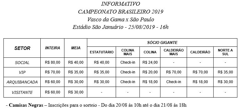 Torcida Vasco: Dia 22/08 às 10h, até 25/08 às 10h