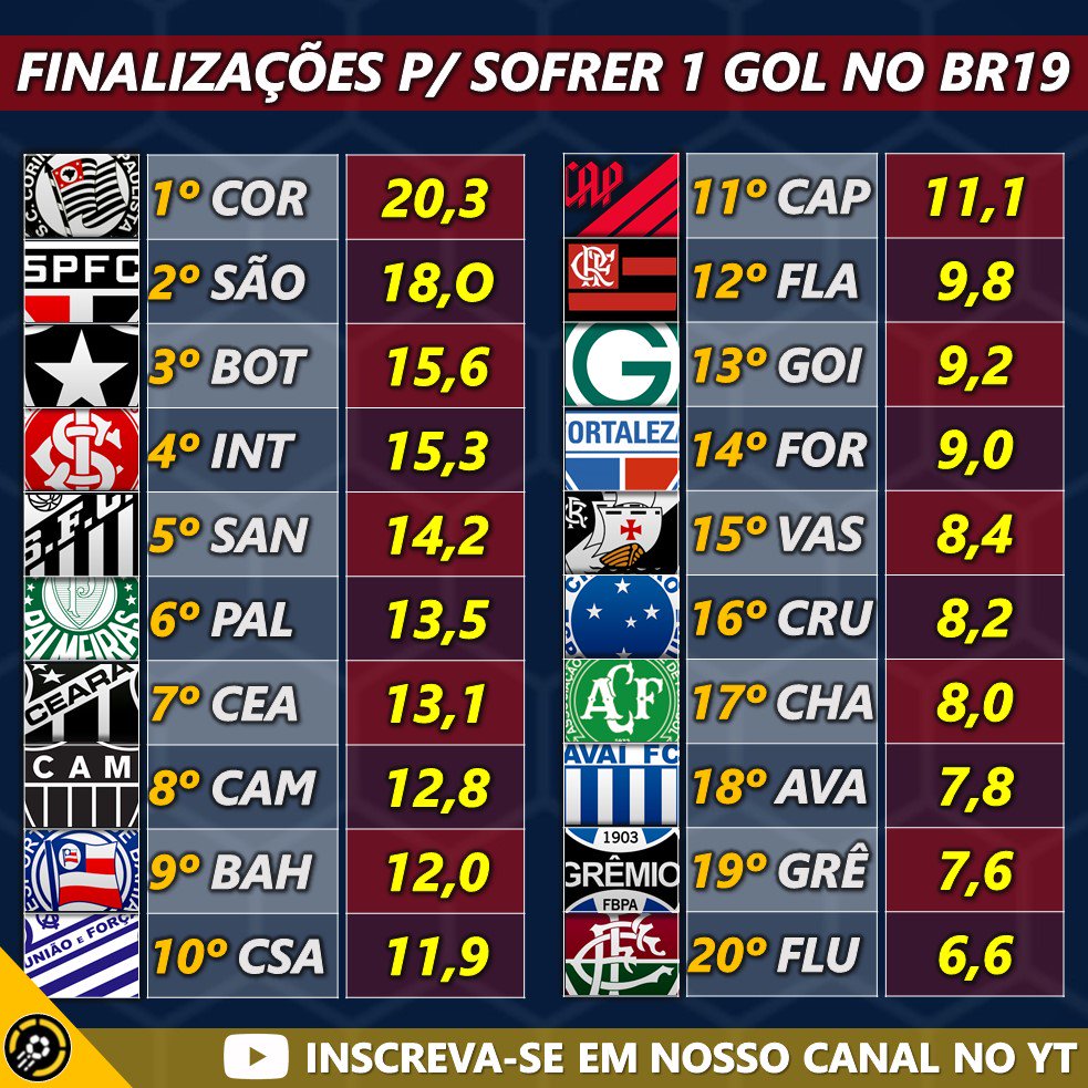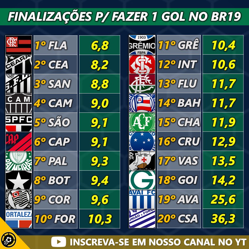 O nº de finalizações necessárias para fazer e para sofrer 1 gol no @Brasileirao