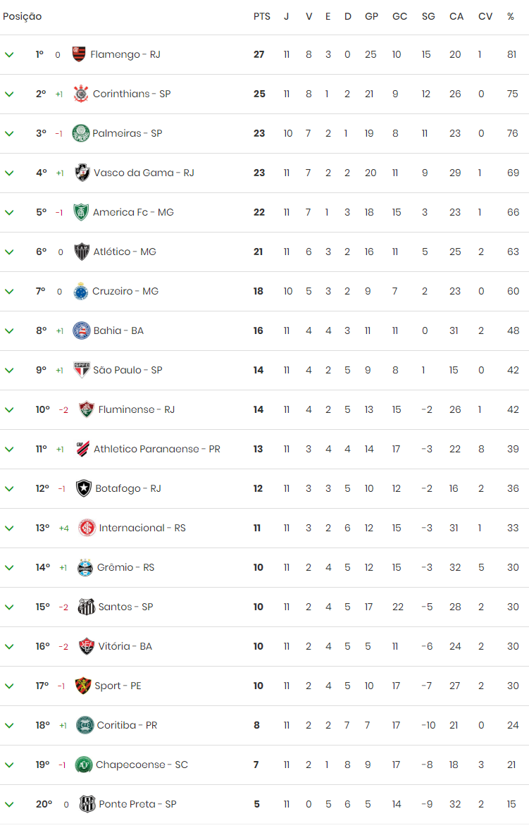 Com o fim da 11ª rodada do Brasileirão Sub-20, o Vasco subiu uma posição, ultrapassando o América-MG, terminando na 4º colocação da competição, com 23 pontos. Na próxima rodada, o Vasco enfrenta a Chapecoense, no dia 01, às 11h, em São Januário.
