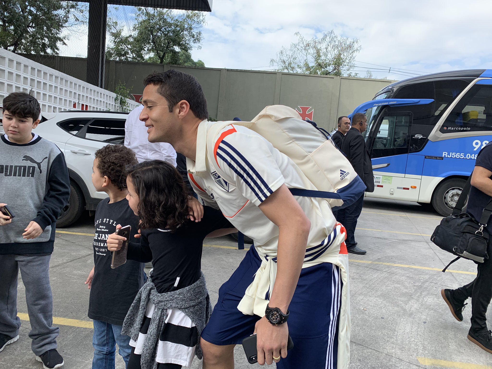 O zagueiro Anderson Martins foi assediado na chegada ao estádio. Parou para tirar foto, falar com funcionários do Vasco... #trcolina
