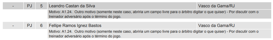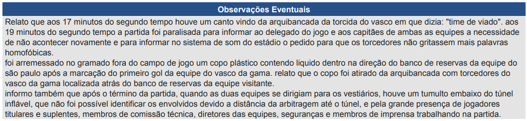 O árbitro de Vasco 2 x 0 São Paulo, Anderson Daronco, relatou na súmula do jogo canto homofóbico da torcida vascaína, copo plástico arremessado no gramado e confusão após a partida. Leandro Castan, que estava pendurado, levou cartão amarelo no fim do jogo e desfalca o time contra o Cruzeiro.