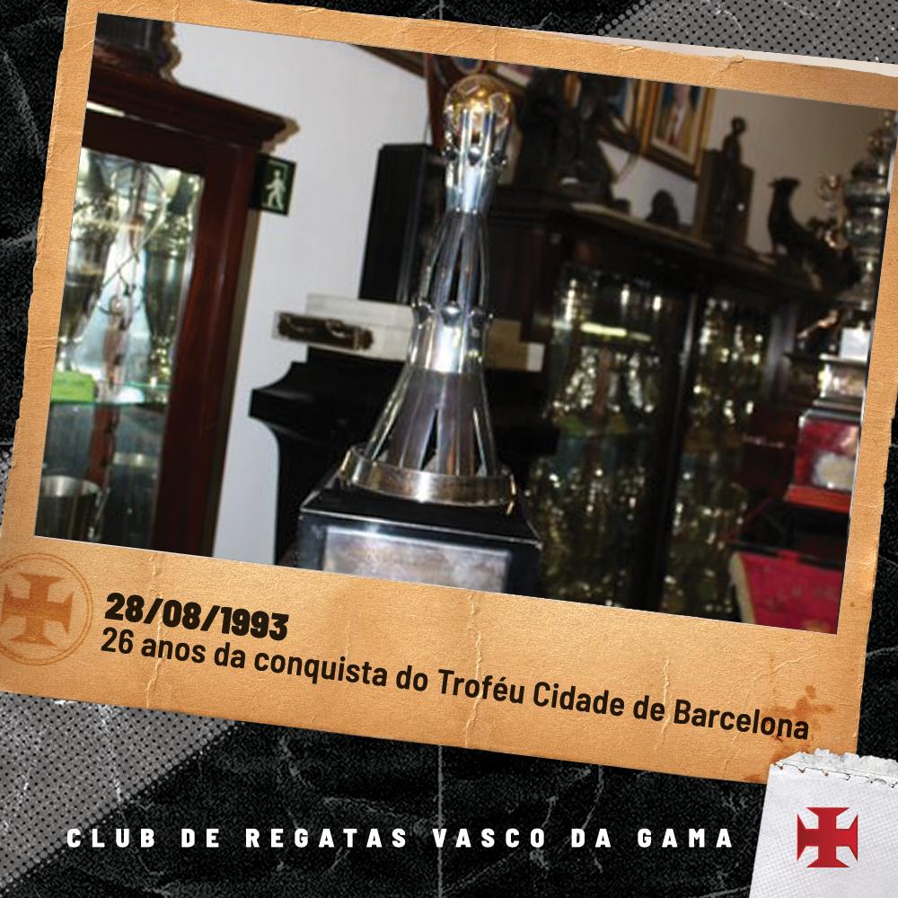 Há 26 anos o #VascoDaGama conquistava o ? Cidade de Barcelona, promovido pelo RCD Español/ESP (atual RCD Espanyol de Barcelona). Em jogo único, o Gigante enfrentou os anfitriões do torneio e venceu por 3x1, com gols de Valdir (2) e Carlos Alberto Dias (1). #CentroDeMemória