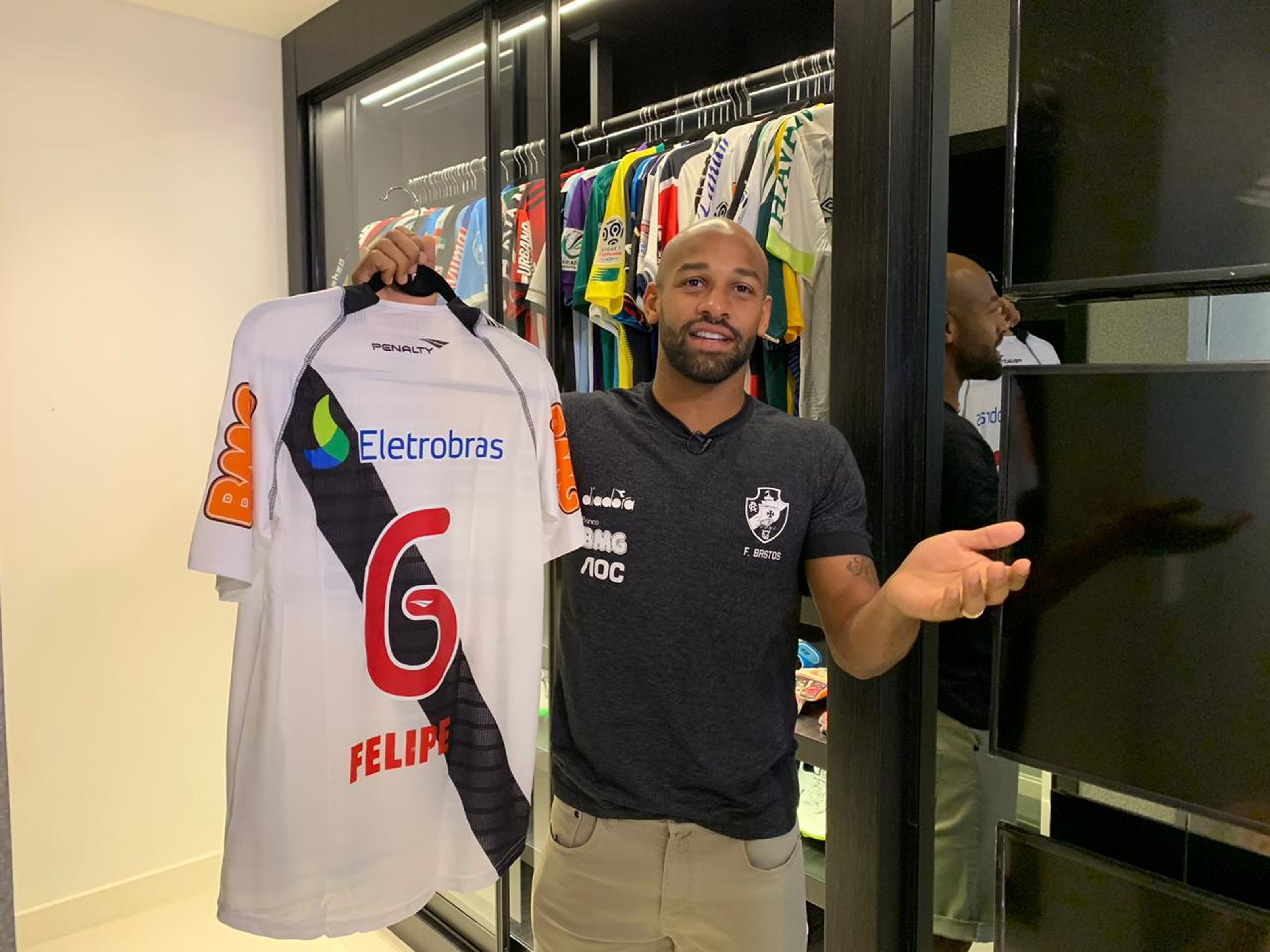 Sabe aquele espaço sobrando em casa, com o qual você não sabe exatamente o que fazer? Fellipe Bastos, graças a uma ideia da esposa Rafaela, está transformando uma espécie de quarto em museu. Isso mesmo: o volante, declaradamente apaixonado pelo Vasco, está reunindo fotos, camisas, troféus, medalhas e muitas histórias em um cantinho mais do que especial.