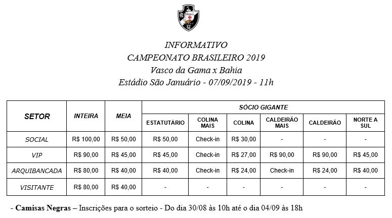 Gratuidade poderá ser retirada APENAS EM SÃO JANUÁRIO NO SETOR ARQUIBANCADA: A retirada da gratuidade estará disponível nos dias 04, 05 e 06 de setembro. Em São Januário, será na Bilheteria 9 para Torcida Vasco e na Bilheteria Mega Loja para Sócio Gigante, mediante apresentação do CPF e RG original ou cópia autenticada.