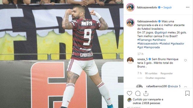 Souza, ex-volante do Vasco, São Paulo e Grêmio, alfinetou Gabigol nas redes sociais após o atacante marcar no empate contra o Internacional, pela Libertadores. Em uma postagem do jornalista Fabio Azevedo enaltecendo o artilheiro do Flamengo, o ex-jogador vascaíno disse que o mérito é todo de Bruno Henrique.