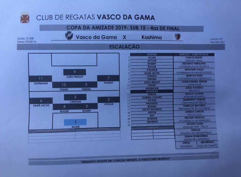 Infantil: Veja a escalação do Vasco para o jogo contra o Kashima Antlers-JAP