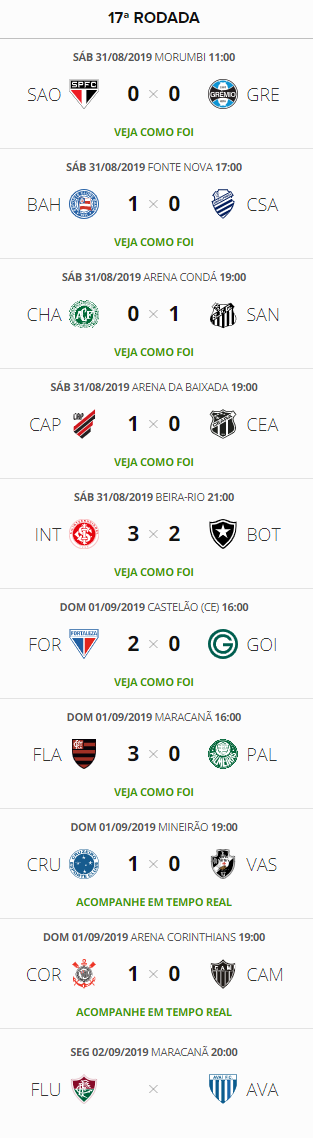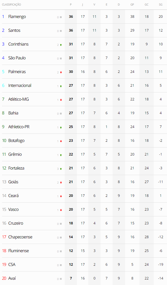 Terminados os jogos do fim de semana da 17ª rodada do Campeonato Brasileiro, o Vasco, que perdeu para o Cruzeiro por 1 a 0, caiu da 14ª para a 15ª colocação. O jogo que fecha a rodada não influi na colocação do Vasco, mas pode modificar sua distância para o Z4 (6 pontos). A distância para as zonas da Sul-Americana (1 ponto) e da Libertadores (7 pontos) permanecerá a mesma.
