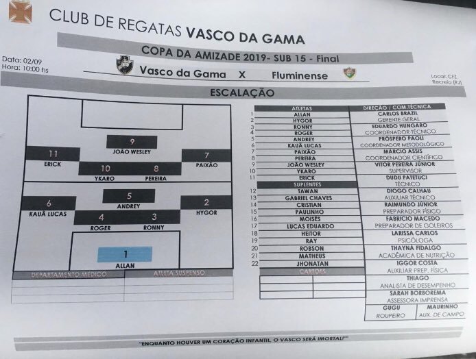 31/08/19 - Infantil: Veja a escalação do Vasco para o jogo contra o Kashima Antlers-JAP