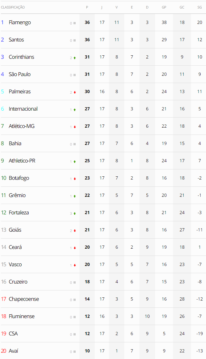 Terminada a 17ª rodada do Campeonato Brasileiro, o Vasco, que perdeu para o Cruzeiro por 1 a 0, caiu da na 14ª para a 15ª colocação.