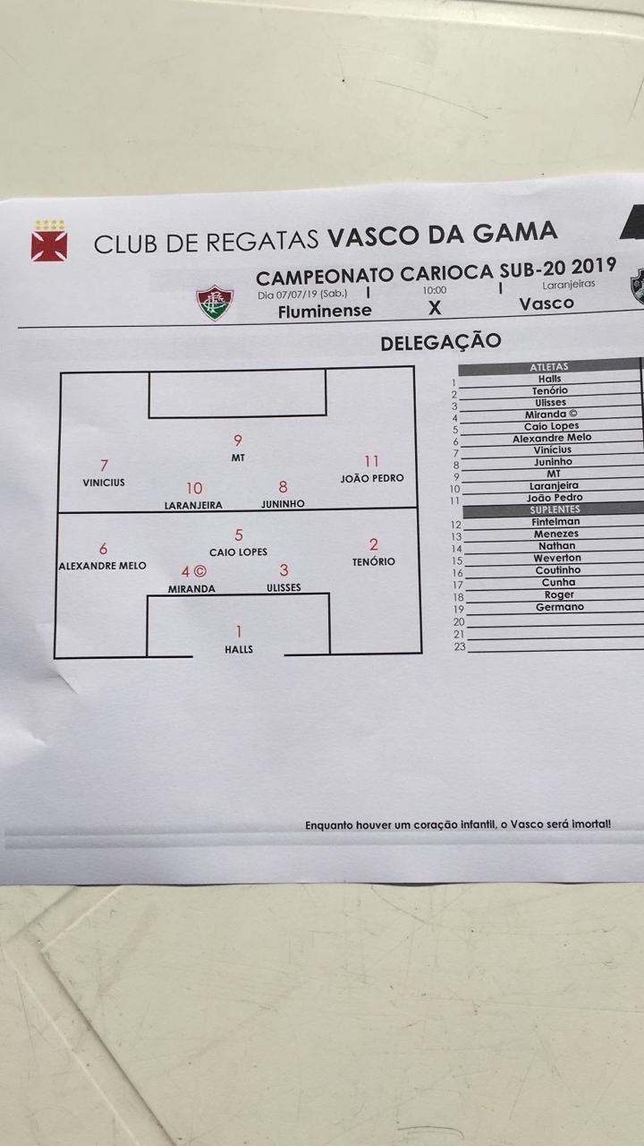 Vasco escalado para enfrentar o Fluminense, pela semifinal da Taça Rio Sub-20, às 10h, no Estádio das Laranjeiras: Halls, Cayo Tenório, Ulisses, Miranda (C) e Alexandre Melo; Caio Lopes, Laranjeira e Juninho; João Pedro, MT e Vinicius Paiva; TÉC: Marcos Valadares.
