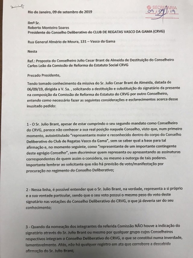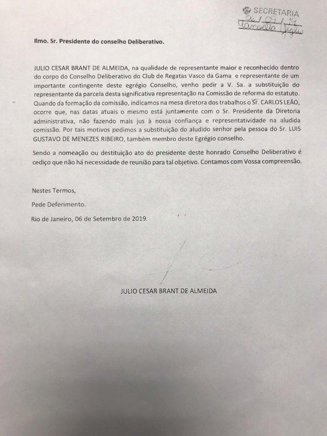 A política do Vasco se acalmou recentemente, mas um novo episódio surgiu nos últimos dias. Membro do grupo "Sempre Vasco" e candidato a presidente na última eleição, Julio Brant entrou com um pedido para que o conselheiro Carlos Leão fosse substituído da comissão de reforma do estatuto do clube.