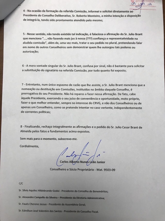 -O presidente Roberto Monteiro sugeriu minha saída no grupo da comissão no dia 21 de agosto. Quinze dias depois o conselheiro Júlio Brant protocolou uma carta com texto confuso e ainda sendo ele um autor que não possui ou demonstrou a representatividade que supõe ou alega ter para a solicitação, conforme expliquei no ofício que protocolei. Em tempo recorde, o presidente Roberto Monteiro acatou a solicitação para me destituir.