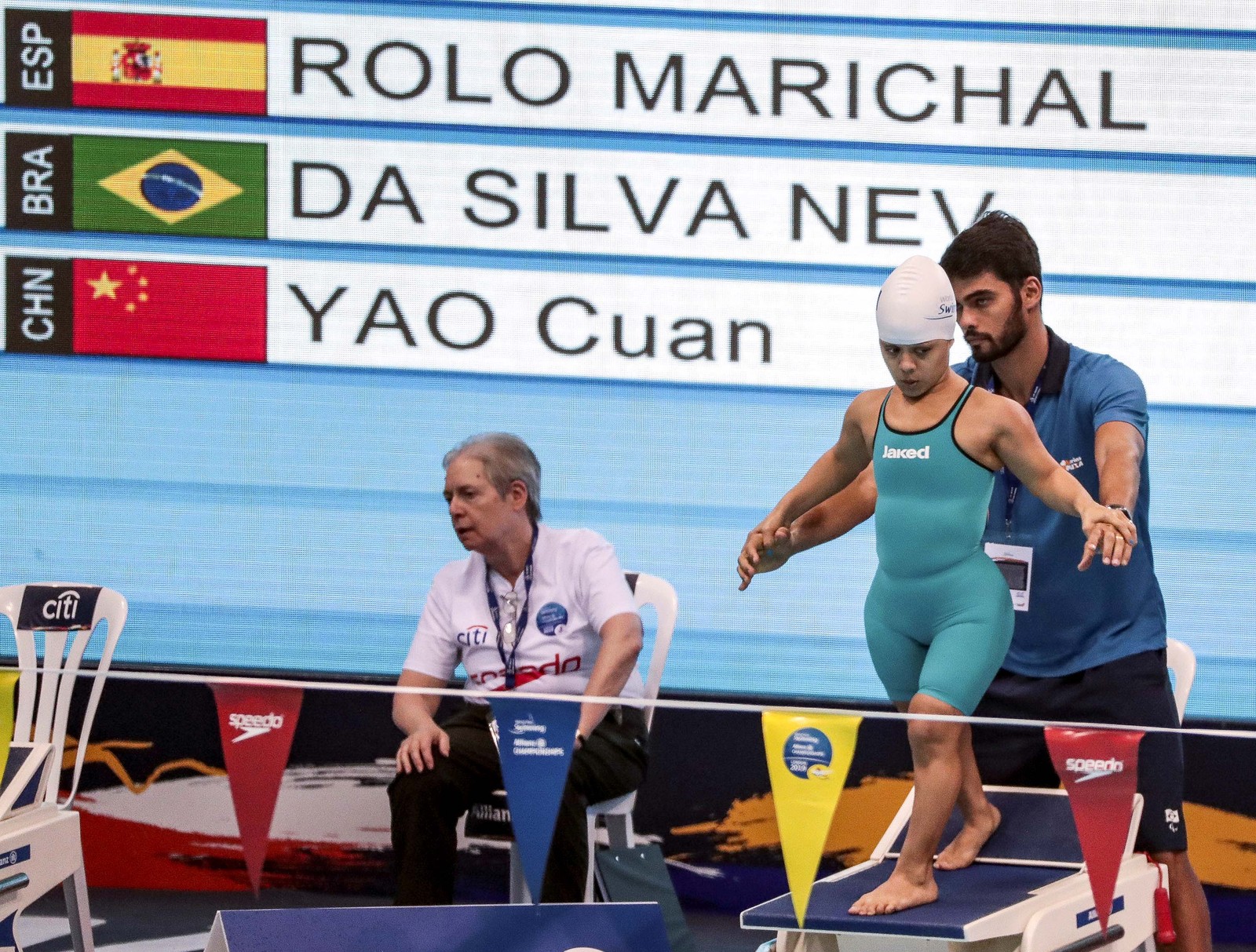 Na segunda-feira, primeiro dia do Mundial na mesma piscina que recebeu as provas dos Jogos Olímpicos e Paralímpicos de 2012, o Brasil terminou com dois ouros, duas pratas e um bronze. Um dos ouros foi com Daniel Dias nos 50m livre da classe S5 (deficiência física). Outra brasileira que ganhou medalhas no primeiro e ficou perto do pódio no segundo foi Joana Neves. Joaninha, como é conhecida no meio, foi bronze também nos 50m livre da classe S5 no primeiro dia.