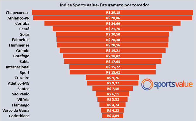 Apresentamos um índice inédito chamado de Faturamento por Torcedor, para os principais times brasileiros. Há um enorme espaço para o desenvolvimento de novas receitas com clubes de futebol.