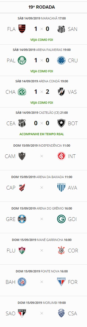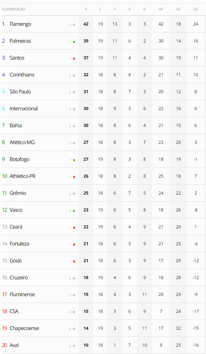 O Vasco, que venceu a Chapecoense por 2 a 1 na Arena Condá, subiu para o 12º lugar no Campeonato Brasileiro após os jogos deste sábado pela 19ª rodada. O Gigante da Colina pode ser ultrapassado neste domingo e caso o Fortaleza e o Goiás vençam seus jogos.
