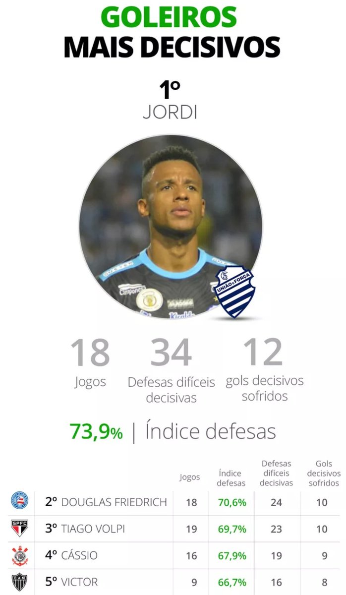 Dados do @globoesportecom revelam que Jordi é o goleiro com mais defesas difíceis quando seu time está ganhando ou empatando, liderando a categoria dos goleiros mais decisivos do Campeonato Brasileiro. Olho nele!