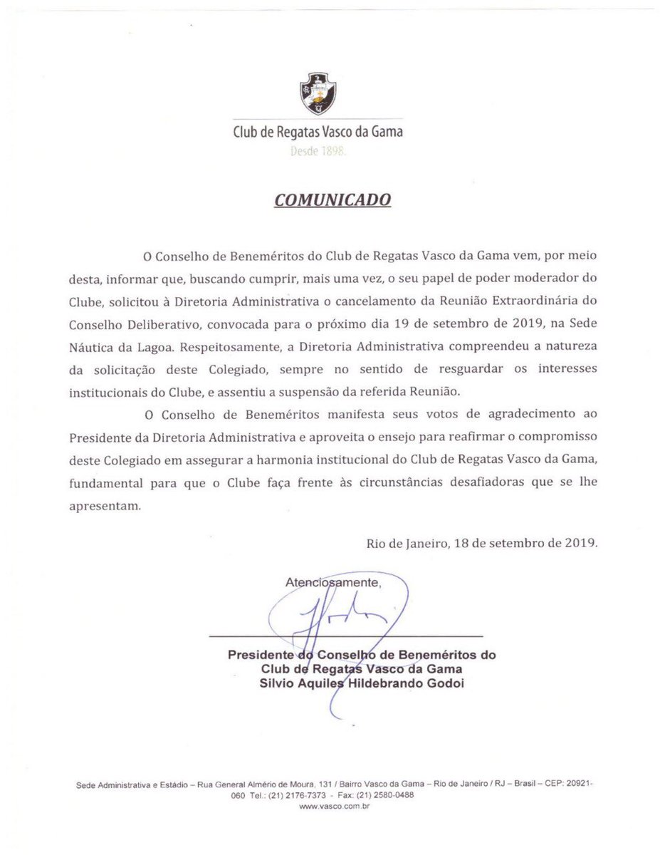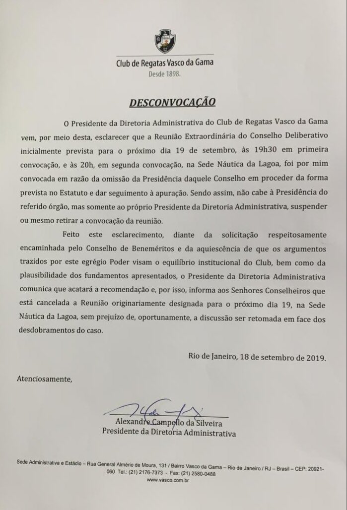 Atendendo a um pedido do Conselho de Beneméritos do Vasco, Alexandre Campello desconvocou a reunião que aconteceria nesta quinta (19) e que analisaria a denúncia de agressão contra o presidente do CD, Roberto Monteiro
