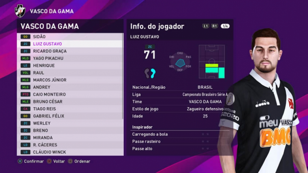 Confira abaixo as imagens e os níveis dos jogadores do Vasco no game PES 2020. O elenco vascaíno está desatualizado; vários jogadores já deixaram o clube, como Luiz Gustavo.