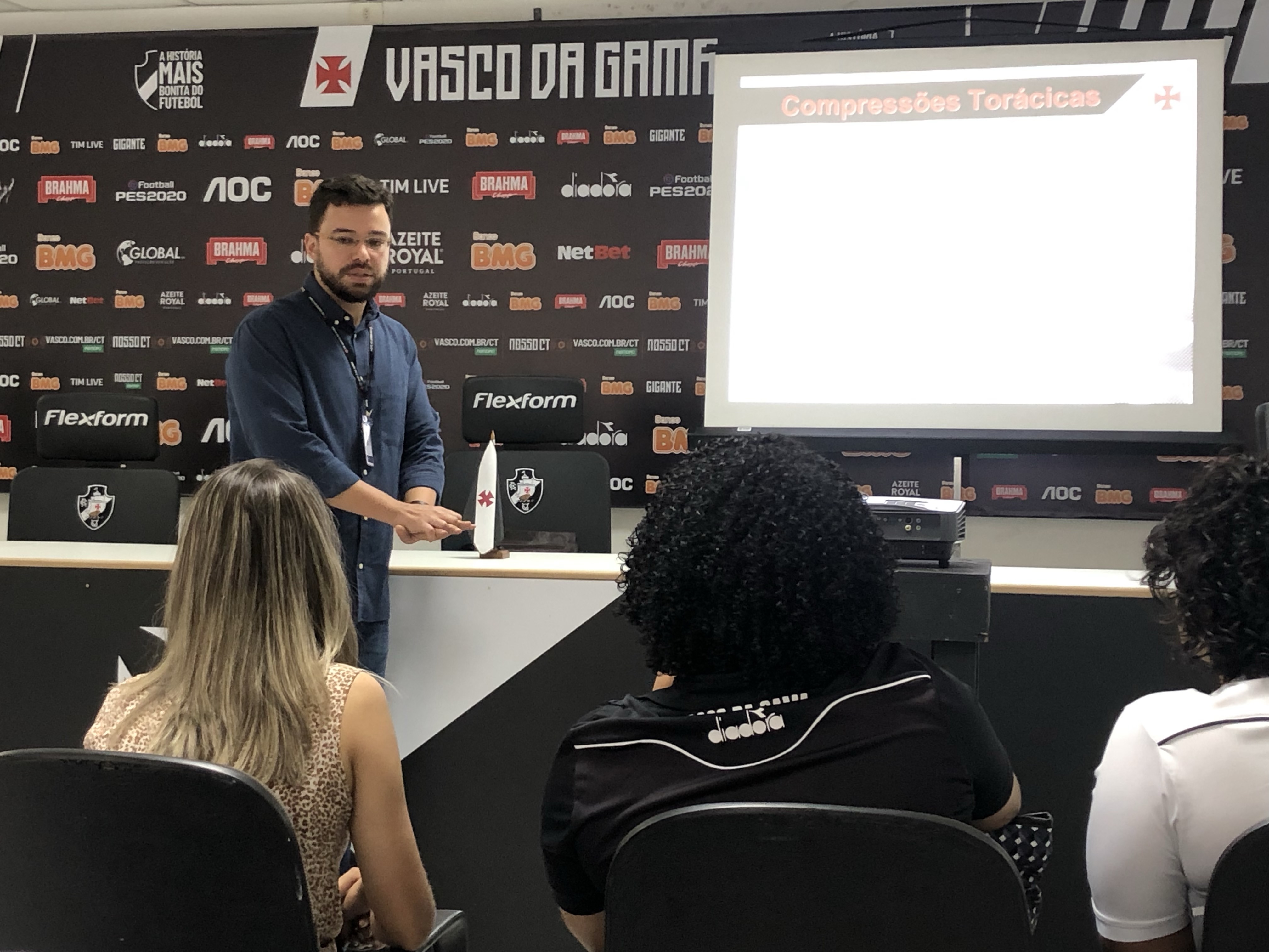 O Departamento Médico do Vasco iniciou nesta quinta-feira (19/9) o treinamento de BLS (Suporte Básico de Vida) e emergências em campo. A atividade foi comandada pelo cardiologista do clube, Mateus Freitas Teixeira, na Sala dos Beneméritos, no Complexo Esportivo de São Januário. Este foi o primeiro dia de treinamento com membros do DM e membros das comissões técnicas das categorias de base do Gigante da Colina.