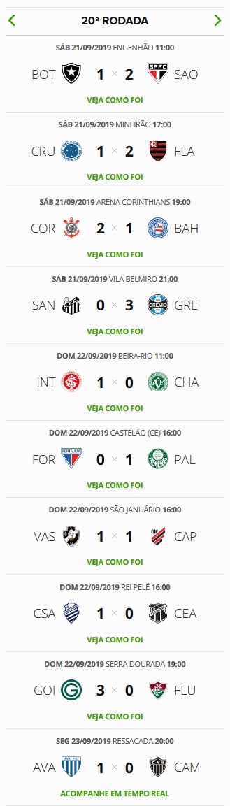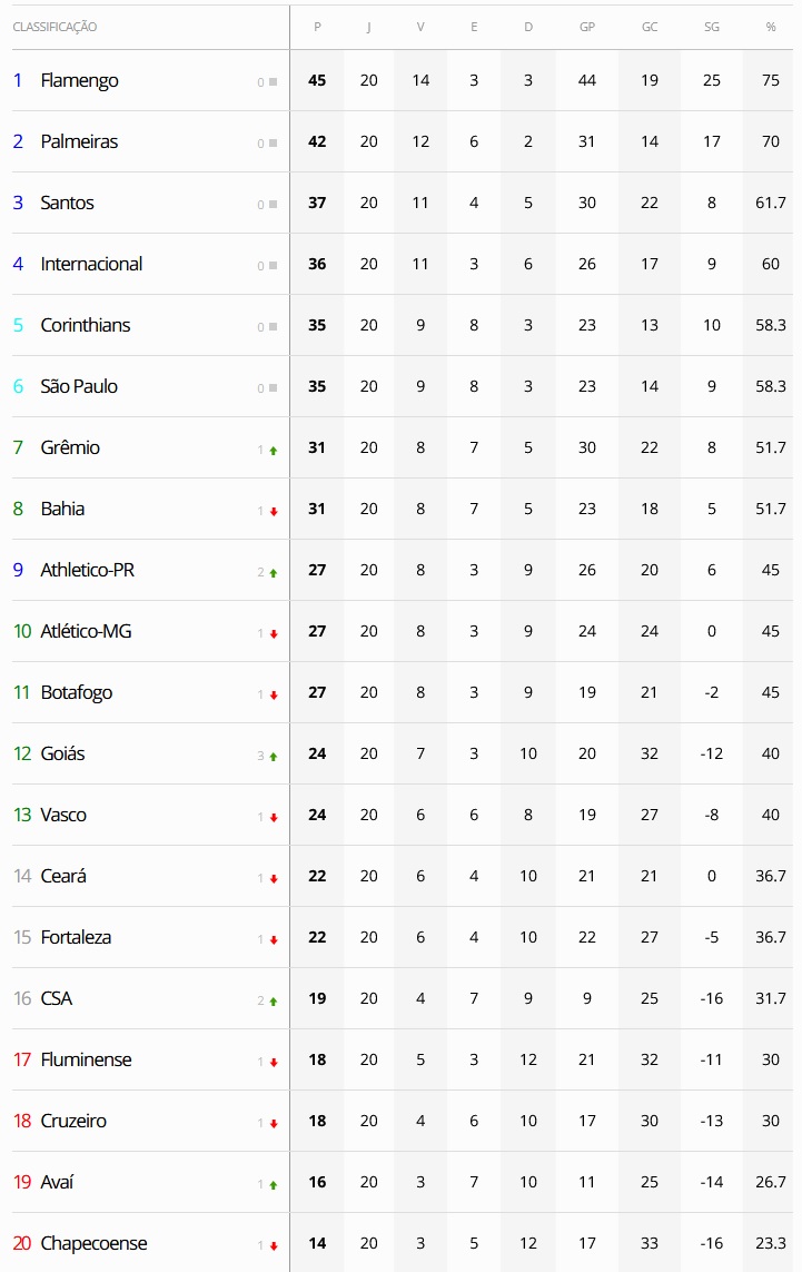 Terminada a 20ª rodada do Campeonato Brasileiro, o Vasco, que empatou com o Athletico-PR por 1 a 1, caiu da 12ª para a 13ª colocação, mantendo-se na zona de classificação para a Copa Sul-Americana 2020.