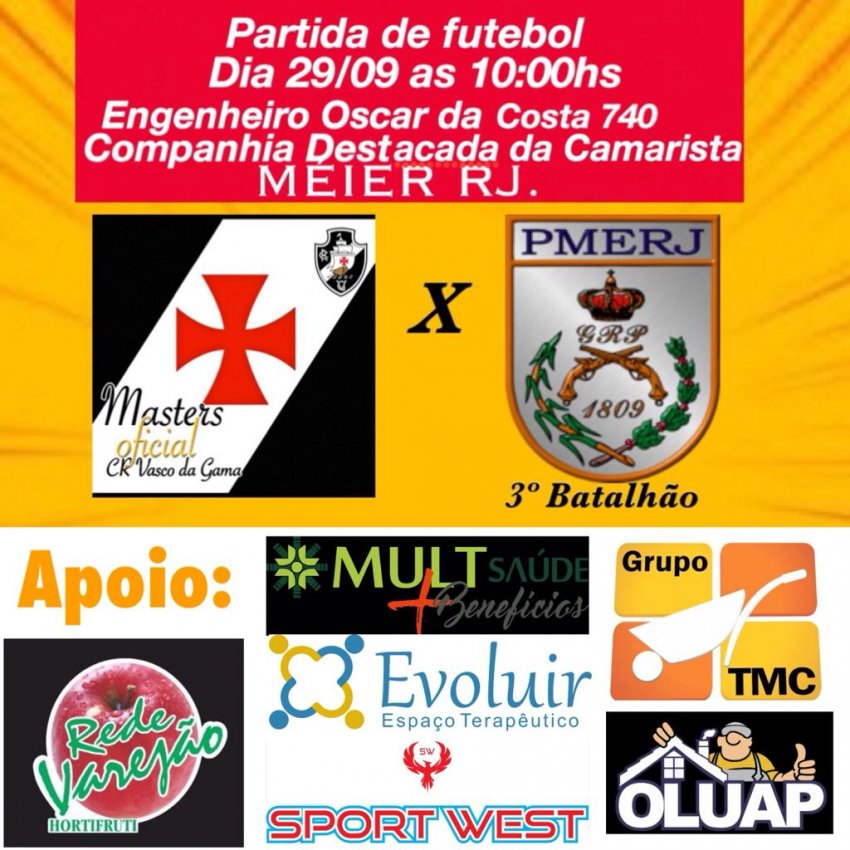 A equipe de Masters do Club de Regatas Vasco da Gama fará uma partida no domingo (29/9) contra o 3º Batalhão de Polícia Militar (Companhia Destacada da Camarista), às 10h, no Méier (Rua Engenheiro Oscar da Costa, 740).