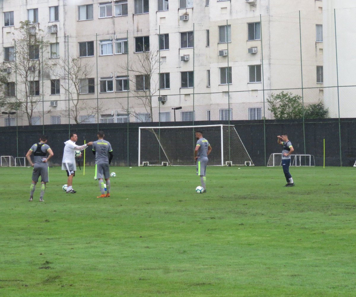 Do outro lado, o auxiliar Mauricio Copertino trabalha com o que deve ser a linha de zaga titular: Pikachu, Werley, Castan e Danilo. #gevas