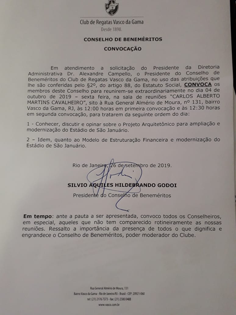 Conselho de Beneméritos atendeu ao pedido de Campello e marcou reunião sobre projeto de São Januário para o dia 4 de outubro. #gevas