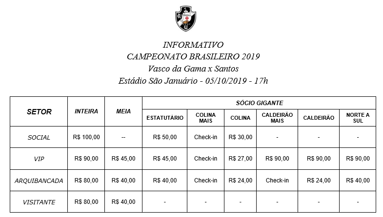 • Crianças: Torcedores menores de 12 anos não pagam ingressos, apresentando CPF e RG original ou cópia autenticada, o seu representante legal deverá retirar a gratuidade do menor nas bilheterias de São Januário. Torcedores que tiverem completado 12 anos, paga preço de meia-entrada. O representante legal deverá apresentar ou adquirir no ato ingresso para o mesmo setor da gratuidade.