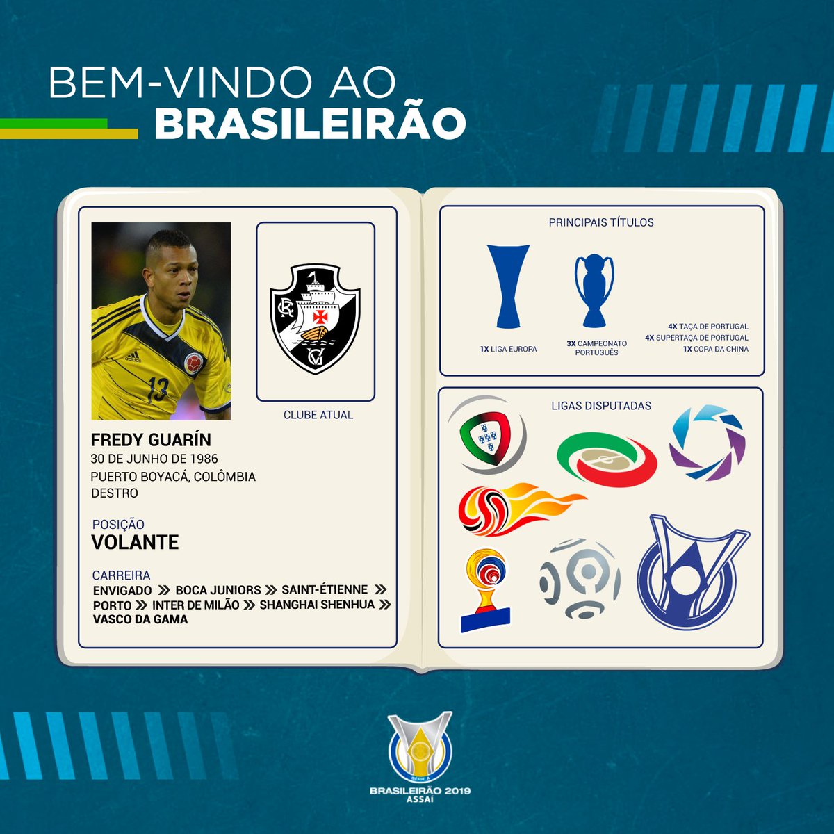 No apagar das luzes... Tem reforço gabaritado no @Brasileirao! O @VascoDaGama anunciou a contratação do volante colombiano Fredy Guarín, que atuou durante anos na Europa e na Seleção Colombiana. Que tenha sucesso aqui no Brasil, na Colina... #BemVindoAoBrasileirao