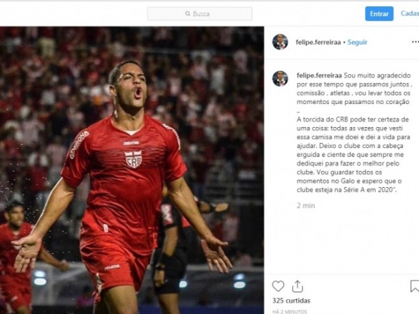 Já pensando como ex-jogador do Galo, de fato, Felipe Ferreira finalizou a postagem reiterando que não se arrepende de se transferir para o Vasco, e também mandando forças ao CRB que luta por uma vaga na Série A da próxima temporada.