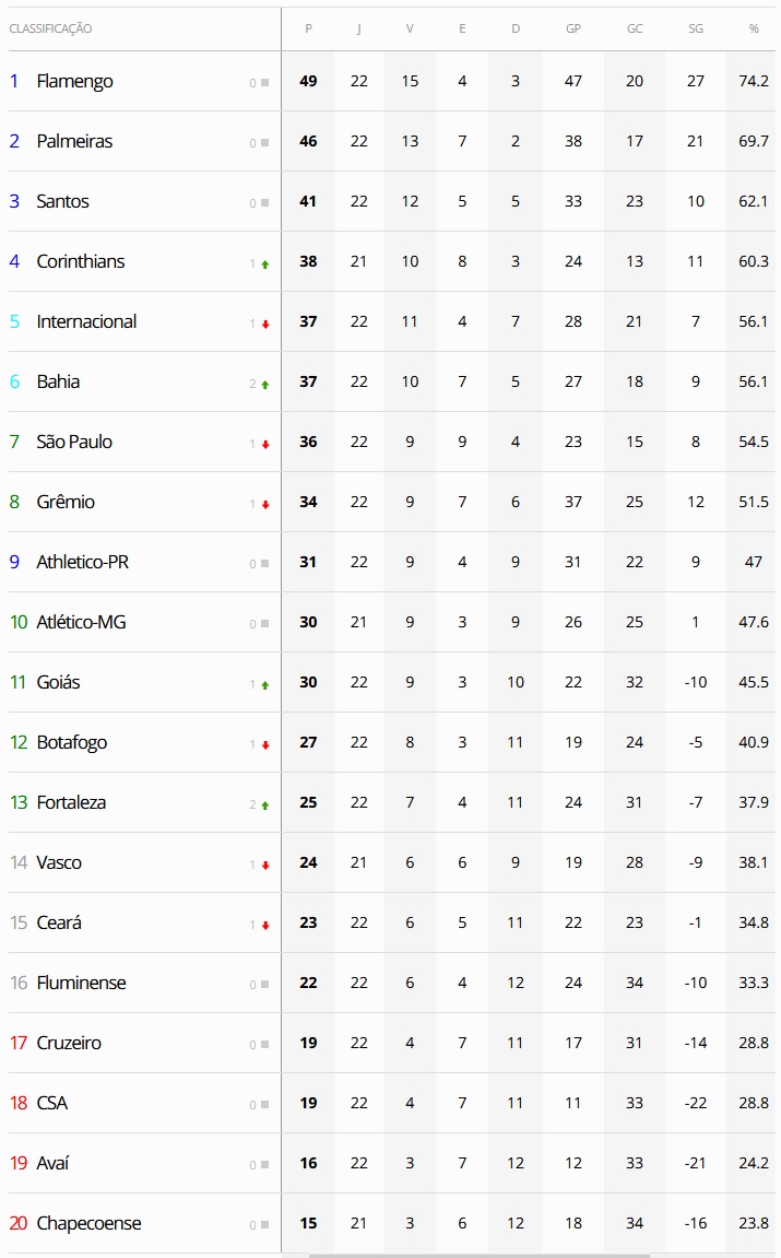 Terminada a 22ª rodada do Brasileiro, o Vasco, que perdeu para o Corinthians por 1 a 0, caiu da 13ª para a 14ª colocação. O Gigante da Colina, no entanto, tem um jogo a menos do que a maioria dos outros clubes. Essa partida, que é contra o Atlético-MG, será cumprida nesta 4ª-feira, em Belo Horizonte.