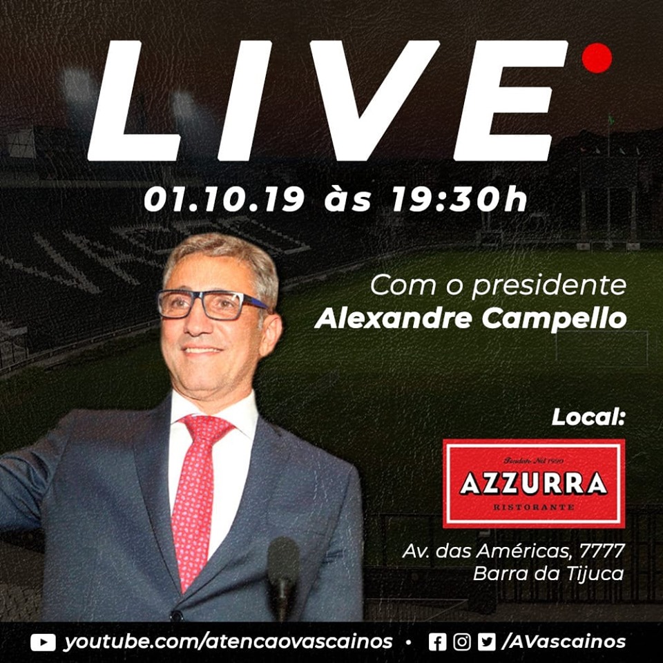 O canal "Atenção, Vascaínos" comemora seus seis meses de vida. Para marcar a data, vamos receber a presença do presidente do Vasco, Alexandre Campello, nesta terça-feira (01/10), às 19h30, direto do Restaurante Azzurra, no Shopping Rio Design Barra. Será uma entrevista exclusiva e com todo o espaço para as perguntas dos torcedores. Você já pode até mandar seu questionamento. Basta colocar nas redes sociais a hashtag #CampellonoAV