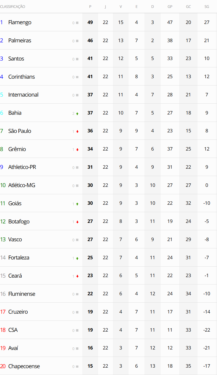Cumpridos os jogos restantes da 21ª rodada, o Vasco, que derrotou o Atlético-MG por 2 a 1, subiu da 14ª para a 13ª colocação, voltando, portanto, à zona de classificação para a Copa Sul-Americana.