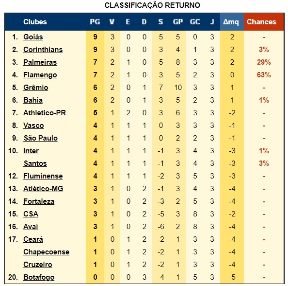 Após 3 rodadas, o Vasco tem a 8ª melhor campanha do returno do Campeonato Brasileiro. São 4 pontos ganhos em 9 disputados.