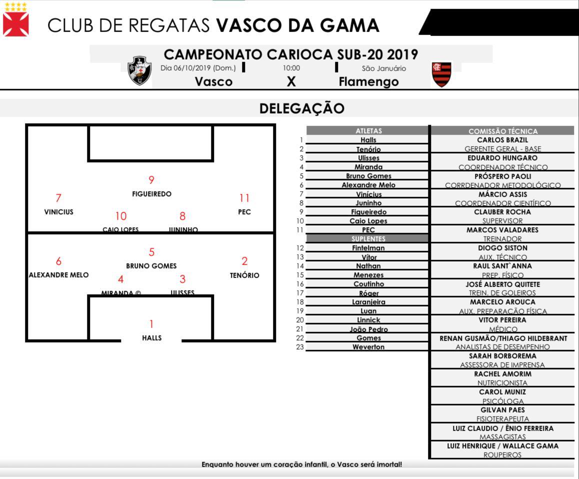 Vasco escalado para enfrentar o Flamengo, pela final da Taça Rio Sub-20, às 10h, em São Januário: Halls, Cayo Tenório, Ulisses, Miranda (C) e Alexandre Melo; Bruno Gomes, Caio Lopes e Juninho; Vinicius Paiva, Gabriel Pec e Figueiredo; Tec: Marcos Valadares