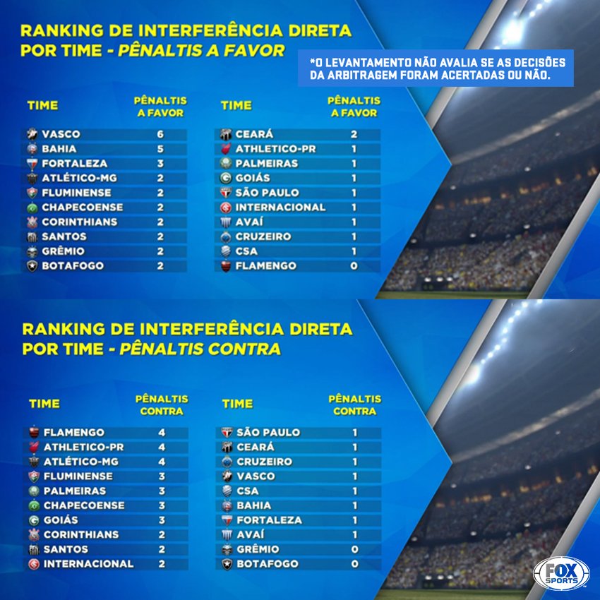 No levantamento, 38 pênaltis foram marcados a partir do uso do VAR. Em 26 oportunidades anulou gol e em 18 validou. Essas interferências representam 73,8% do total de vezes que o árbitro de vídeo foi acionado. O Vasco da Gama foi o clube que teve o maior número de interferências favoráveis do VAR no Campeonato Brasileiro, 12 ao todo. Cinco vezes foram contrárias, totalizando 17 interferências. Em seguida, vem o Bahia com oito a favor e quatro contrárias, totalizando 12. Fechando o top 3, o Grêmio, com seis a favor e duas contrárias, totalizando oito. O Palmeiras é o clube que tem mais interferências contrárias. O Alviverde soma oito intervenções adversas e três favoráveis.