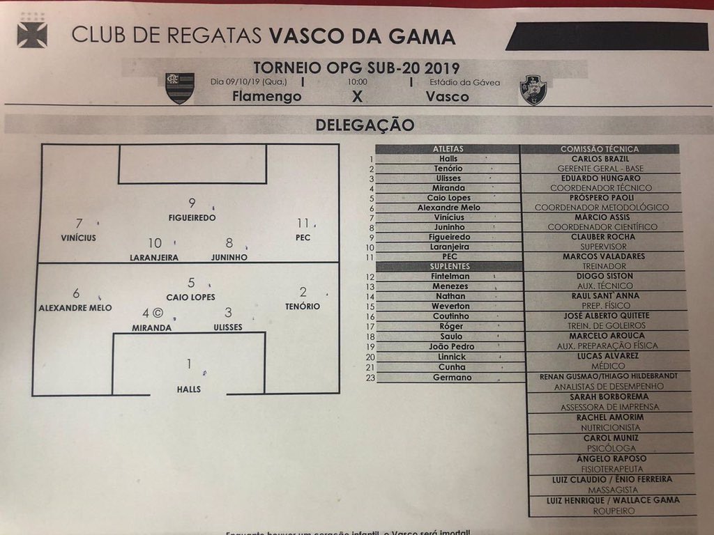 Vasco escalado para enfrentar o Flamengo, pela final do Torneio OPG Sub-20, às 10h, na Gávea: Halls, Cayo Tenório, Ulisses, Miranda (C) e Alexandre Melo; Caio Lopes, Laranjeira e Juninho; Vinicius Paiva, Gabriel Pec e Figueiredo; Tec: Marcos Valadares
