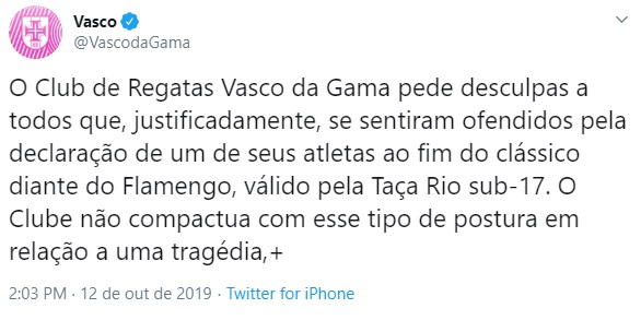 14:25 - Juvenil: Goleiro Cadu fez menção à tragédia no Ninho do Urubu; em nota, Vasco se desculpa