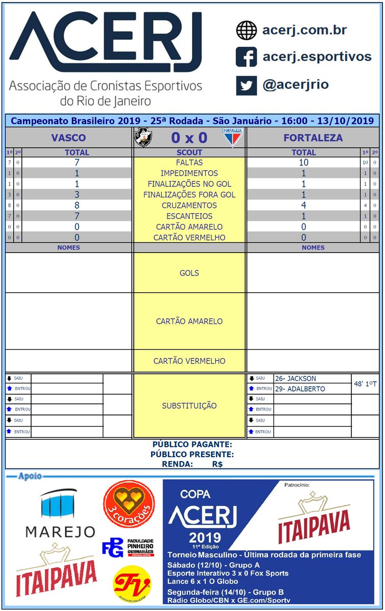 Scout do 1º Tempo de Vasco e Fortaleza pela 25ª Rodada do Campeonato Brasileiro 2019 em São Januário #acerjinforma #VASxFOR #Brasileirão2019