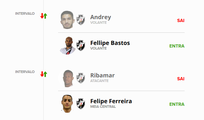 Vasco volta para o 2º tempo com duas novidades: Fellipe Bastos e Felipe Ferreira entram, Andrey e Ribamar saem