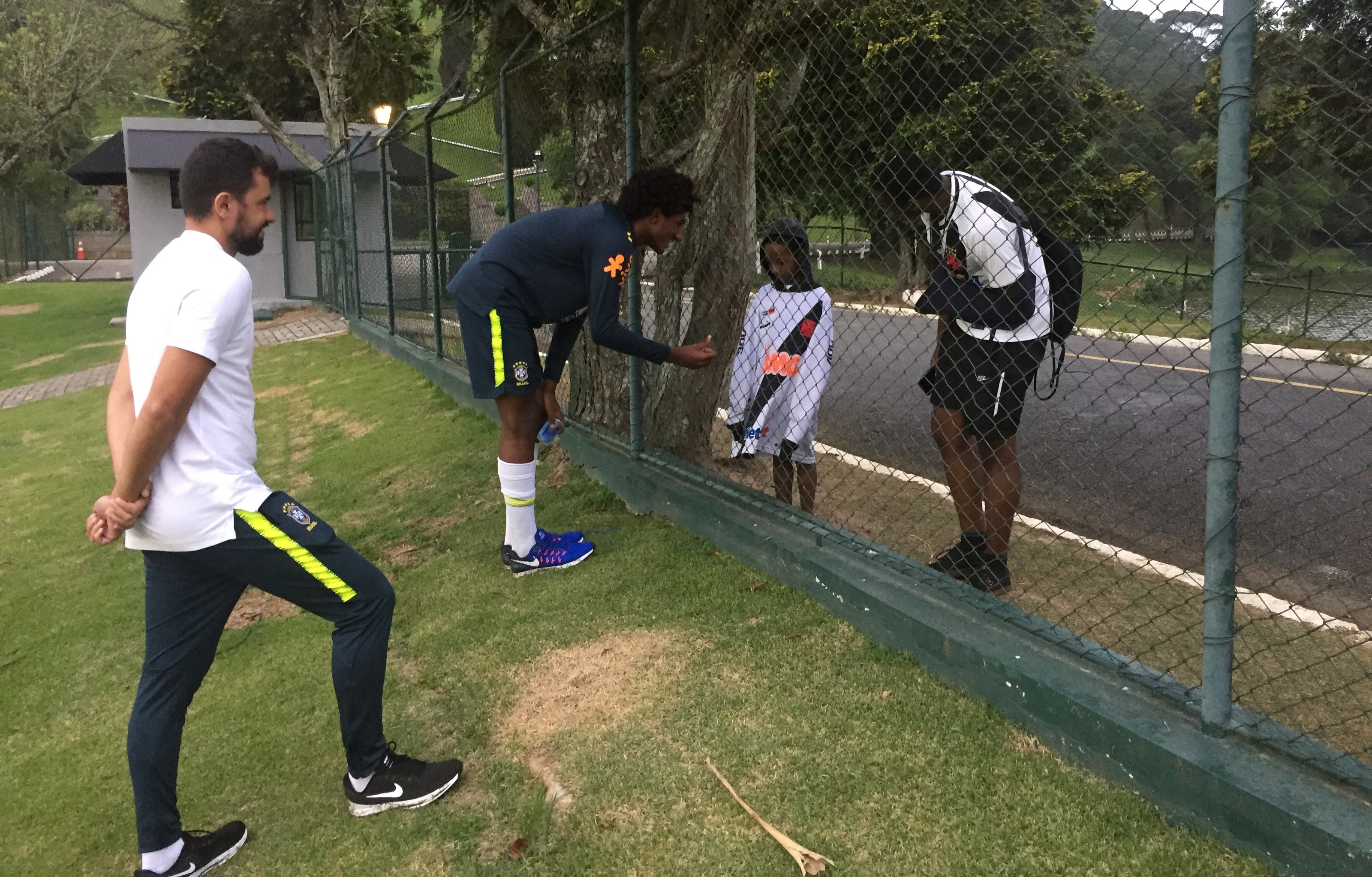 O pequeno Pedro, de 7 anos, tremia de frio, mas não se importou. Suportou a garoa fina e o vento gelado da Granja Comary para tirar sua camisa do Vasco e dar para Talles Magno autografar. Depois de ter esperado duas horas. E depois de ter visitado o local pela manhã, quando não houve treino. Assim foi o primeiro dia do jovem ídolo cruz-maltino com a seleção brasileira sub-17.