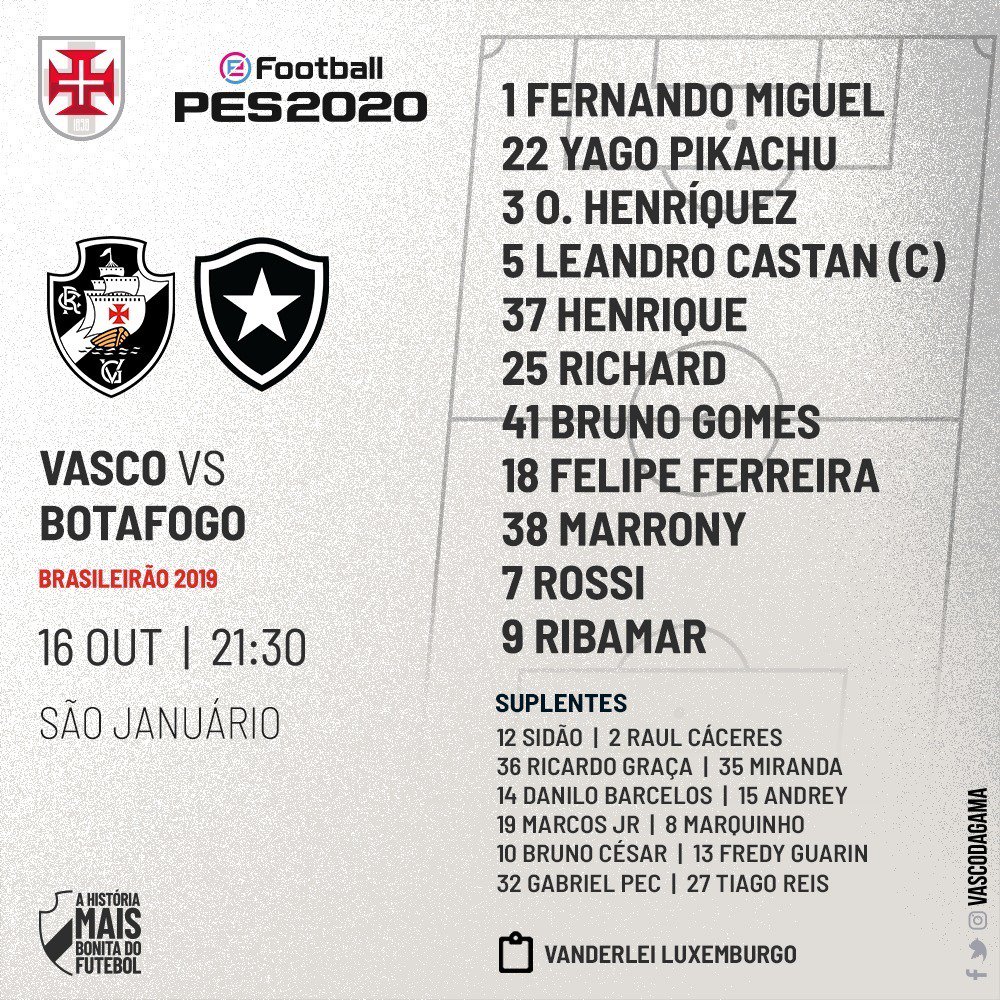16/10/19 - Confira os relacionados do Vasco para o jogo contra o Botafogo; Fredy Guarín é a novidade
