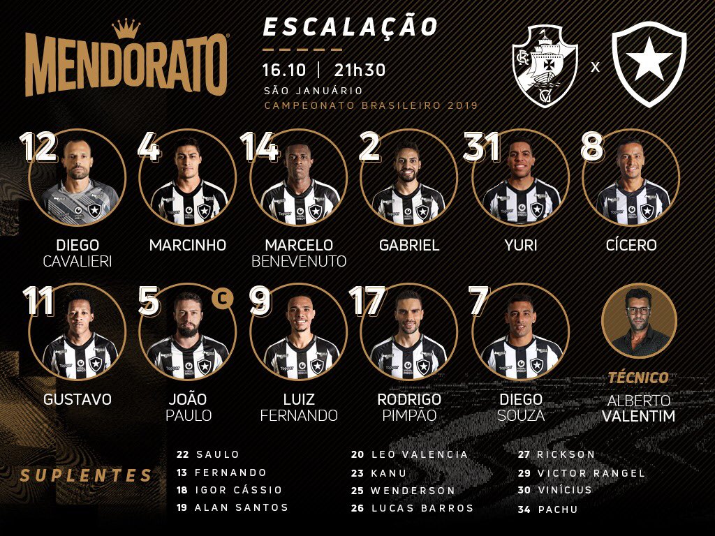 Veja a escalação do Botafogo para o jogo contra o Vasco; ex-vascaínos Rodrigo Pimpão e Diego Souza são titulares