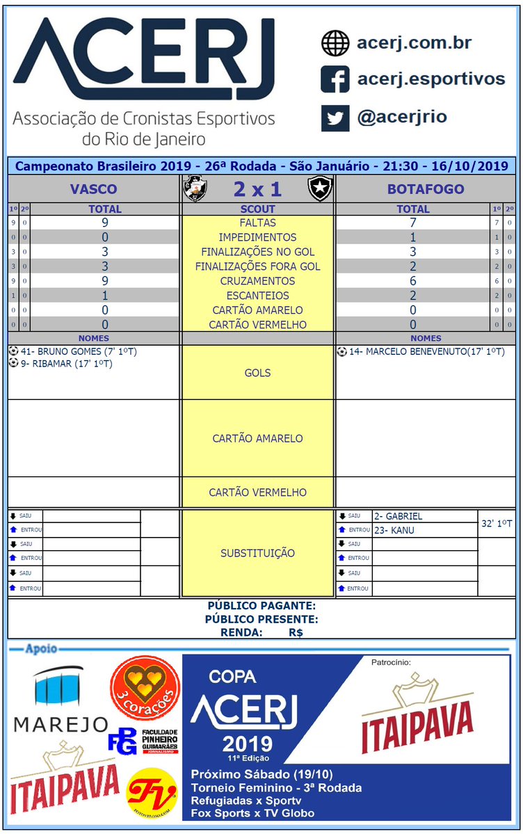 Scout do 1º Tempo de Vasco e Botafogo pela 26ª Rodada do Campeonato Brasileiro 2019 em São Januário #acerjinforma #VASxBOT #Brasileirão2019