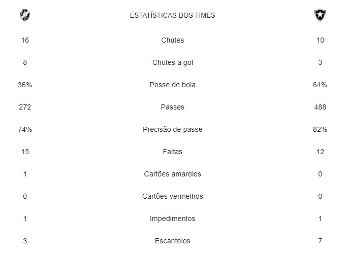 Somente nos minutos finais, os alvinegros esboçaram uma pressão. No entanto, o Vasco soube segurar o ímpeto final dos visitantes para manter a vantagem até o apito final em São Januário.