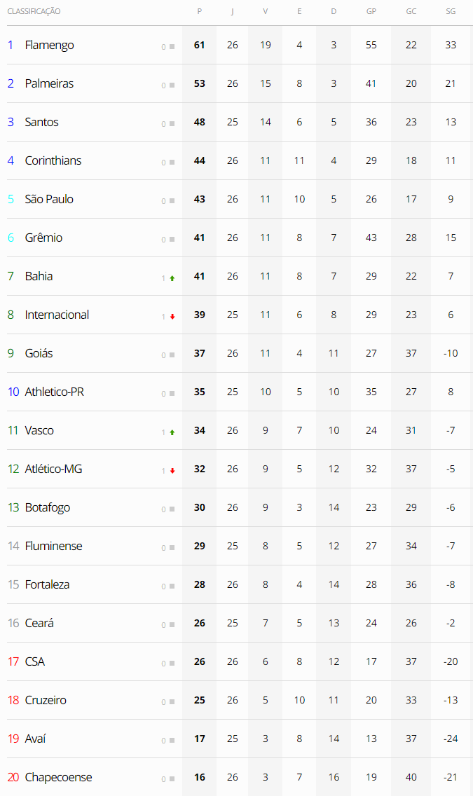 Mesmo faltando 3 jogos para o fim da 26ª rodada, já é possível afirmar que o Vasco, que venceu o Botafogo por 2 a 1, terminará a rodada em 11º lugar, ganhando uma posição na classificação, 8 pontos à frente do Z4 e 7 (ou 8, dependendo do resultado do Inter) abaixo do G6.