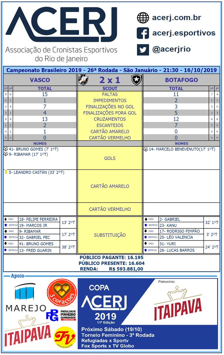 Scout Final de Vasco e Botafogo pela 26ª Rodada do Campeonato Brasileiro 2019 em São Januário #acerjinforma #VASxBOT #Brasileirão2019
