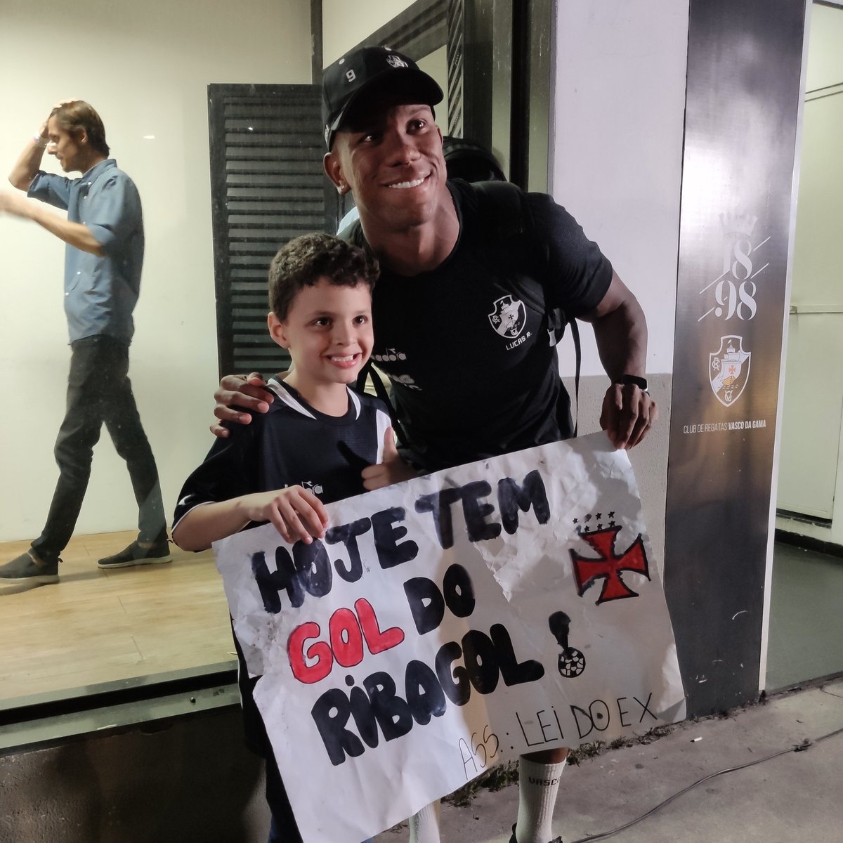 Criança vascaína posa para foto com cartaz ao lado de Ribamar: 'Hoje tem gol do Ribagol'