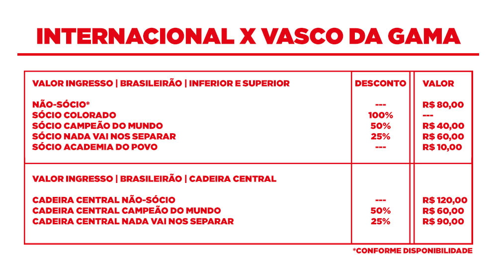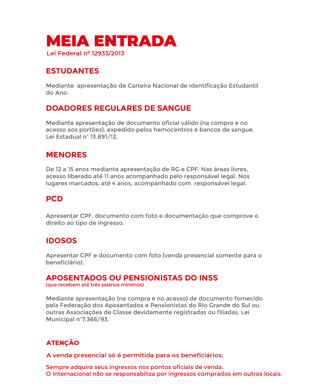 >> O Sport Club Internacional não se responsabiliza pela compra de ingressos fora dos canais de venda oficiais (internet e bilheteria no estádio). Qualquer denúncia de venda de ingressos falsos poderá ser realizada no dia do jogo diretamente no Juizado do Torcedor, situado entre os portões 2 e 3 do estádio. <<