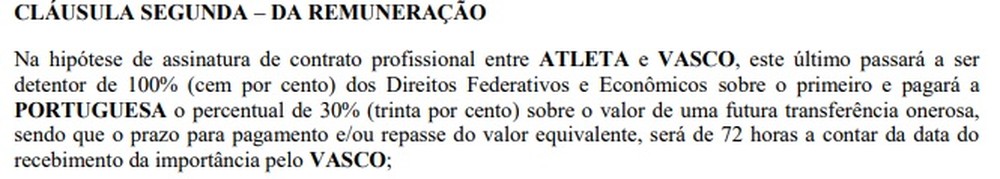 Um contrato em papel timbrado enviado pelo jurídico do Vasco traz na cláusula segunda o seguinte: "Na hipótese de assinatura de contrato profissional entre ATLETA e VASCO, este último passará a ser detentor de 100% (cem por cento) dos Direitos Federativos e Econômicos sobre o primeiro e pagará a PORTUGUESA o percentual de 30% (trinta por cento) sobre o valor de uma futura transferência onerosa, sendo que o prazo para pagamento e/ou repasse do valor equivalente, será de 72 horas a contar da data do recebimento da importância pelo VASCO.